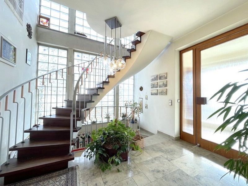 Schon beim Ankommen spürt man, dass dieses Haus anders gedacht wurde. Der Eingangsbereich mit Natursteinboden ist angenehm großzügig gestaltet. Die geschwungene Wendeltreppe setzt einen architektonischen Akzent und verbindet die Ebenen auf elegante Weise. Über einen Rundbogen öffnen sich die Wohnräume in einem fließenden Übergang, der dem Grundriss Struktur verleiht.