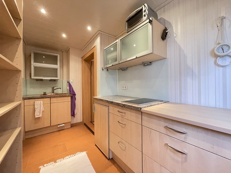Das Obergeschoss bietet eine ähnliche Aufteilung mit Küche, Wohnzimmer und Schlafzimmer. Ein kleineres Zimmer ergänzt die Etage und eignet sich beispielsweise als Homeoffice oder Ankleide.