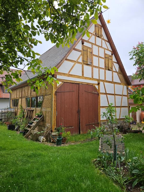 Ein angebautes Nebengebäude mit Garage und Werkstattraum verbindet das Wohnhaus optisch mit der großzügigen, sanierten Scheune. Diese bietet im Erdgeschoss Abstellmöglichkeiten für weitere Fahrzeuge sowie Lagerflächen auf zwei zusätzlichen Ebenen.