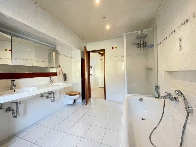 Im Obergeschoss befindet sich das große Familienbad mit Tageslicht, Badewanne, Dusche, Bidet, WC und Doppelwaschbecken. Dazu kommen ein großzügiges Kinderzimmer sowie das Schlafzimmer mit separater Ankleide und Zugang zum Balkon.