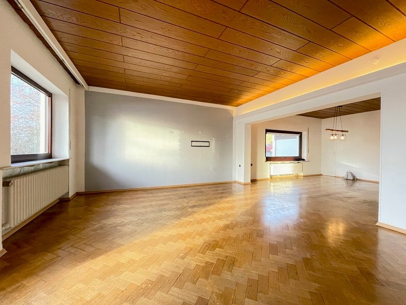 Über die breite Auffahrt mit Hofbereich geht es bequem zur Garage und den drei Außenstellplätzen. Von dort sind es nur ein paar Schritte bis zur Haustür. Sie kommen durch den Windfang und den Flur ins Haus und der Blick geht direkt in den großzügigen Wohn- und Essbereich mit Parkettboden und hohen Decken. Der nostalgische Kachelofen sorgt dabei für warme Wohlfühlmomente. Direkt daneben liegt ein weiteres Zimmer, das sich ideal als Homeoffice oder Spielezimmer anbietet. Vom Wohn- und Essbereich geht es außerdem direkt auf die Terrasse und weiter in den Garten. Die Küche ist separat gehalten und zeichnet sich durch reichlich Raum