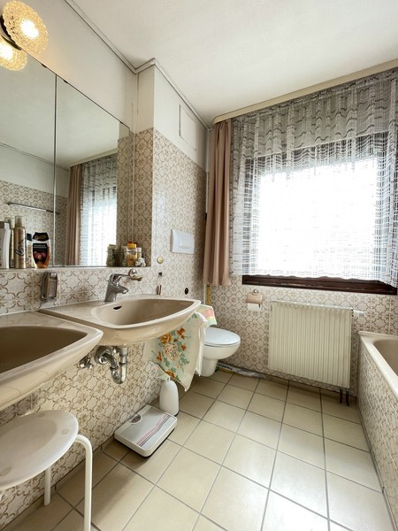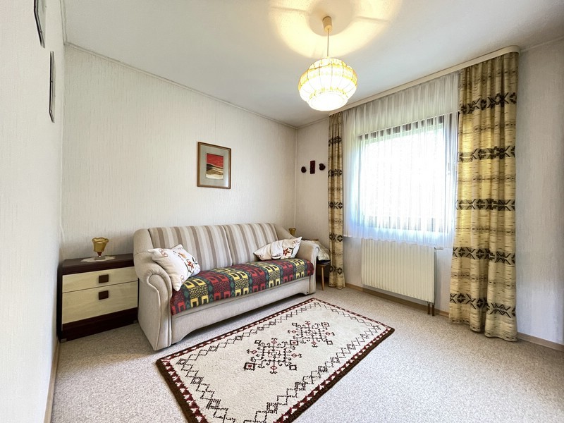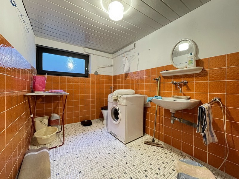 Der freie Blick in die Ferne macht diesen Platz zu etwas ganz Besonderem – ein Ort, an dem man gerne verweilt und einfach mal die Seele baumeln lässt. Etwas abseits des lebendigen Wohnbereichs bietet das Erdgeschoss auch einen ruhigen Rückzugsort. Hier befinden sich das Schlafzimmer sowie zwei weitere Räume, die sich ideal als Kinder- oder Arbeitszimmer nutzen lassen. Ergänzt wird dieser private Bereich durch ein Badezimmer mit Badewanne, Dusche und WC. Auch das Untergeschoss bietet viele Möglichkeiten. Ob zusätzlicher Gästebereich, eigenes Reich für Teenager oder Arbeitszimmer – hier gibt es viel Platz für individuelle Ideen. Neben einer Küche, einem Hobbyraum und einem Vorratsraum finden Sie hier auch eine Waschküche mit Waschbecken und WC. Vom Untergeschoss gelangen Sie direkt in die beiden Garagen – perfekt für Familien mit mehreren Autos oder für all jene, die zusätzlichen Platz für eine Werkstatt benötigen. Der Heizungsraum mit Ölzentralheizung (Baujahr 1991, Brenner von 2001) rundet diese Ebene ab.