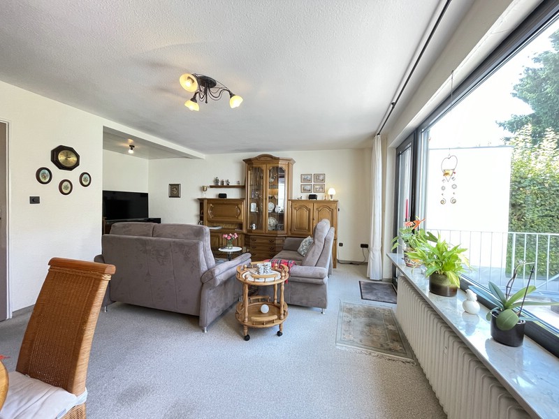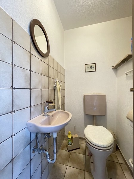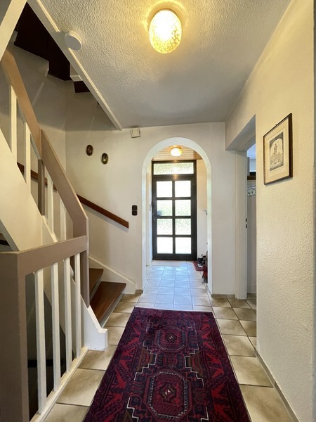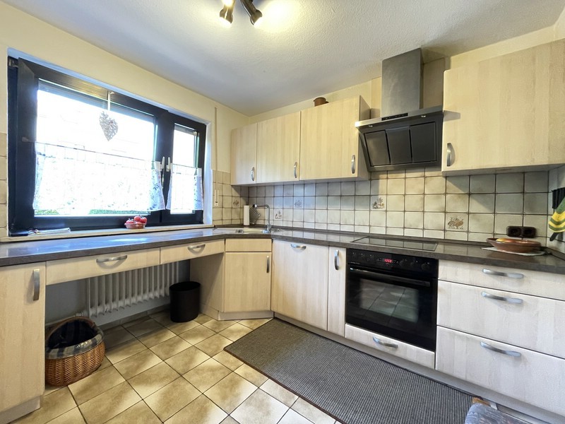 Sie betreten die Immobilie über einen Windfang und erreichen von hier aus ein praktisches Gäste-WC, die geräumige Küche (eine Einbauküche ist bereits vorhanden) sowie das große, helle Wohn- und Esszimmer mit direktem Zugang auf die im Jahr 2008 erneuerte und zum Westen hin ausgerichtete Terrasse.