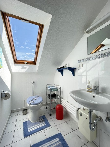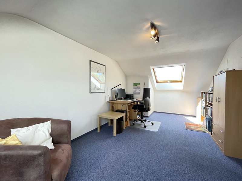 Das darüber liegende Dachgeschoss ist bereits ausgebaut und bietet neben einem schönen Raum mit verschiedenen Nutzungsmöglichkeiten (z.B. Homeoffice oder Gästezimmer) noch zusätzlichen Stauraum in Form eines Speichers und ein separates WC.
