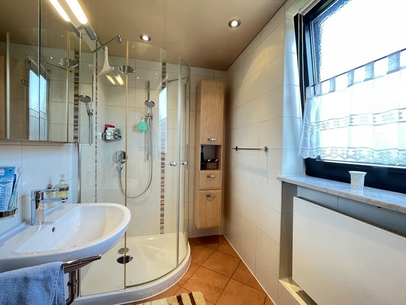 Vom Flur aus führt eine schöne, gewendelte Holztreppe in die anderen Stockwerke. Im Obergeschoss des Hauses erwarten Sie ein Elternschlafzimmer und zwei ähnlich große Kinderzimmer. Das Tageslichtbad, 2008 modernisiert, ist mit einer großen Eckdusche, WC, Waschbecken und Fußbodenheizung ausgestattet. Ein praktischer Abstellraum steht Ihnen hier ebenfalls zur Verfügung.