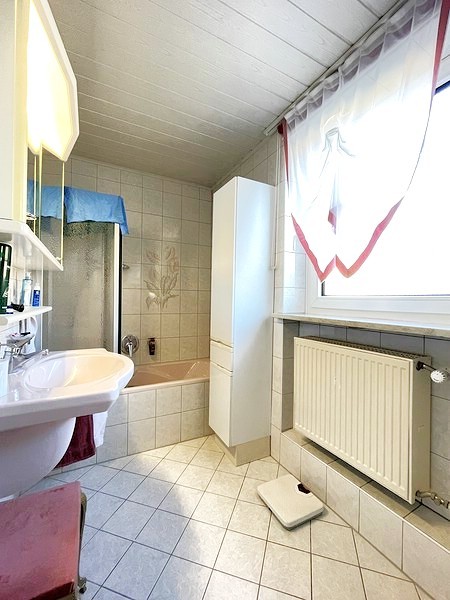 Eine gewendelte Holztreppe verbindet die Etagen, zusätzlich ist ein Treppenlift vorhanden. Im Obergeschoss liegen drei Schlafzimmer: ein Elternzimmer und zwei fast gleich große Kinderzimmer, fair verteilt und ohne Streit-Potenzial. Das Tageslichtbad ist mit einer Wanne ausgestattet, dazu gibt es einen Abstellraum auf der Etage – für alles, was nicht ständig im Weg stehen soll.