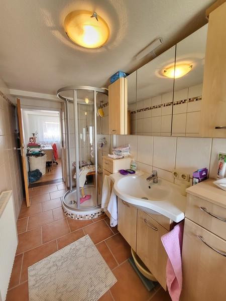 Das Badezimmer im Erdgeschoss ist über das Wohnzimmer zugänglich und mit Badewanne, Waschbecken, Fenster und Waschmaschinenanschluss ausgestattet. In der Obergeschosswohnung wurde das Bad im Rahmen eines Anbaus (1978) moderner gestaltet – mit Dusche, Waschbecken, Waschmaschinenanschluss und Tageslicht. Zusätzlich bietet diese Etage ein separates Esszimmer für mehr Raum und Flexibilität.