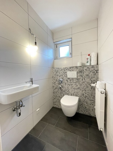 Die Küche ist ein separater Raum, praktisch gestaltet und mit dem Boiler für Warmwasser ausgestattet. Besonders einladend ist das neuwertige, im Jahr 2023 renovierte, Tageslichtbad: eine große Dusche mit Glaswand, Fußbodenheizung und Handtuchheizkörper, Waschbecken sowie die elegante Kombination aus anthrazitfarbenen Bodenfliesen und großen weißen Wandfliesen. Das WC liegt in einem eigenen Raum und ist im gleichen Design gehalten.