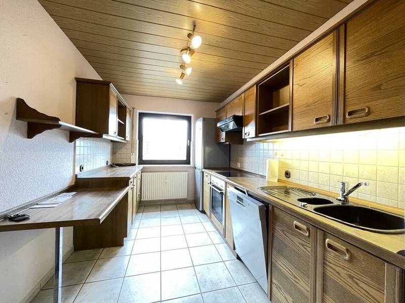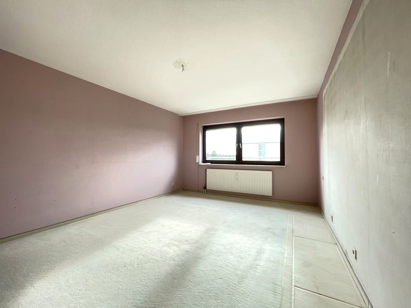 Ein großzügiger Flur mit praktischem Einbauschrank bildet den einladenden Eingangsbereich der Wohnung. Von hier aus öffnet sich der Raum zu einem offenen Wohn- und Essbereich, der mit rund 28 m² (!!) reichlich Platz bietet, direkten Zugang zum Balkon ermöglicht und bei Bedarf auch problemlos abgetrennt werden kann. In dieser Höhe genießen Sie einen weiten Blick über die Dächer der Umgebung – ein echtes Plus im Alltag.