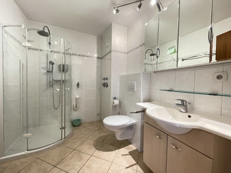 Eine separate Küche und ein Gäste-WC sorgen für zusätzlichen Komfort. Über einen charmanten Rundbogen gelangt man in den privaten Bereich der Wohnung, bestehend aus einem großen Schlafzimmer sowie einem weiteren Zimmer, das sich flexibel als Büro oder Kinderzimmer nutzen lässt. Das Badezimmer präsentiert sich mit einer stilvollen Eckdusche, WC und Waschmaschinenanschluss in zeitlosem Design.