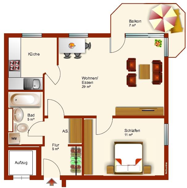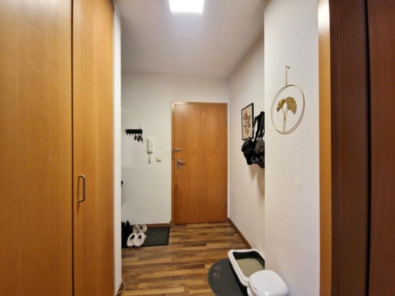 Sie betreten die Wohnung über eine Diele mit praktischem Einbauschrank und erreichen von hier aus das innenliegende Bad mit Wanne und Waschmaschinenanschluss, das geräumige Wohn-/Esszimmer mit direktem Zugang auf den großzügigen und sonnigen Süd-West-Balkon sowie zur Küche dem gemütlichen Schlafzimmer.