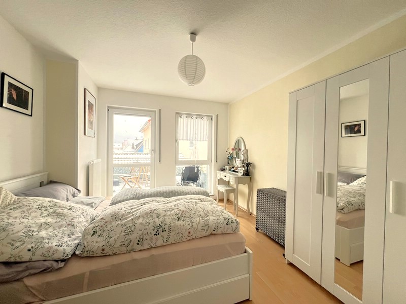 Das großzügige Wohnzimmer ist über eine breite Durchreiche mit der Küche verbunden und schafft so eine offene, helle Wohnatmosphäre. Sowohl vom Wohnbereich als auch vom Schlafzimmer gelangen Sie auf den sonnigen Balkon mit schönem Blick auf den Moritzberg – der perfekte Ort, um entspannte Stunden im Freien zu genießen.