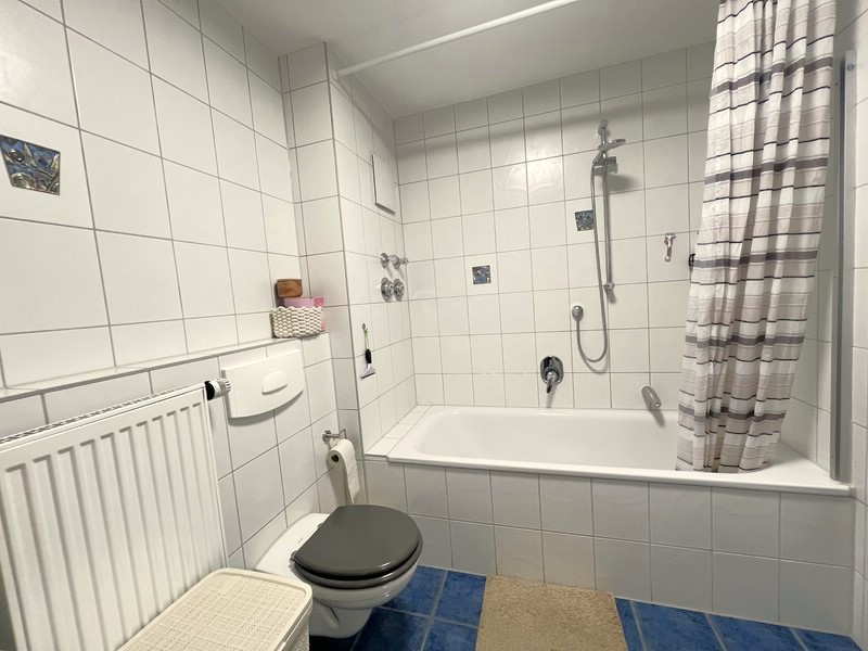 Das geräumige Badezimmer ist mit einer Badewanne sowie einem Waschmaschinenanschluss ausgestattet. Direkt angrenzend befindet sich ein praktischer Abstellraum, der zusätzlichen Stauraum bietet.