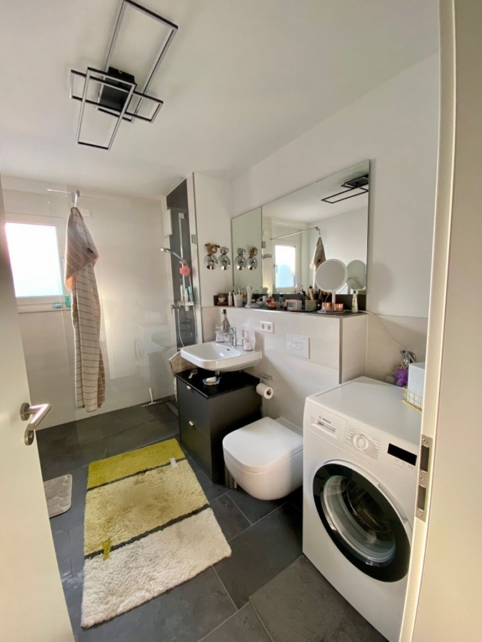 Das stilvolle Tageslichtbad ist modern ausgestattet und verfügt über eine großzügige, ebenerdige Dusche, ein Waschbecken sowie einen praktischen Waschmaschinenanschluss. Zusätzlich steht Ihnen ein separates Gäste-WC mit Fenster zur Verfügung – ein weiterer Komfortfaktor dieser Wohnung.
